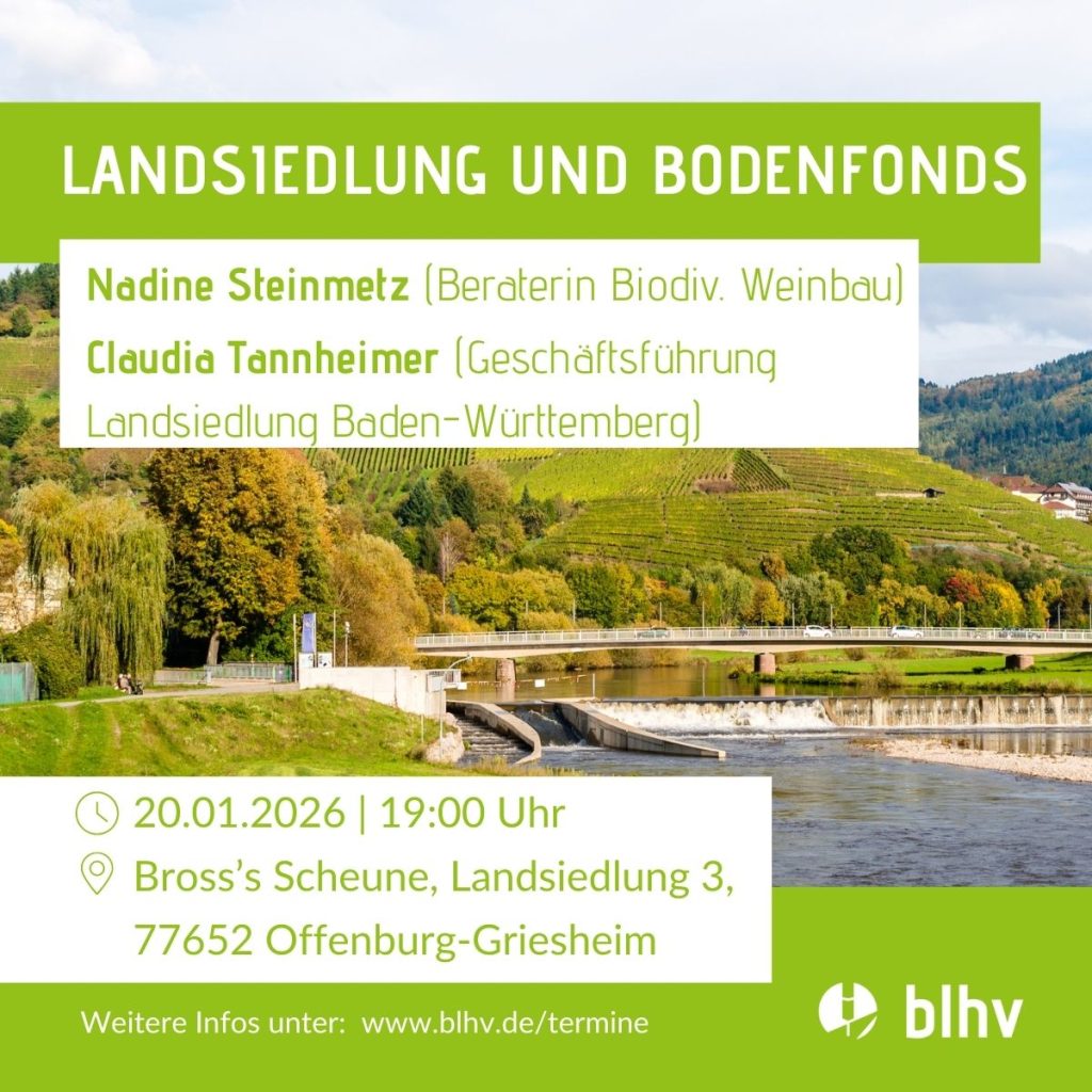 Am 20. Januar werden Nadine Steinmetz, Beraterin Biodiversität im Weinbau und Claudia Tannheimer, Geschäftsführerin der Landsiedlung Baden-Württemberg gemeinsam zum Thema „Landsiedlung und Bodenfonds“ referieren. Freut euch auf spannende Einblicke und die Möglichkeit zum Austausch im Anschluss an den Vortrag.