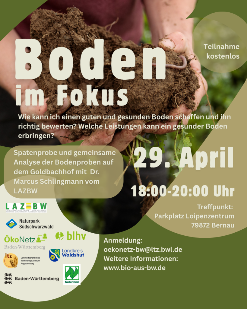 Oft unterschätzt, aber ebenso wichtig: Bodenstruktur und -fruchtbarkeit im Grünland. Referent Marcus Schlingmann erläutert uns auf dem Goldbachhof die Besonderheiten des Grünland-Bodens. Mittels Spatenprobe besprechen wir Analyse, Bewertung und Maßnahmen für den Bodenaufbau und deren Wirkungen im Grünland. Treffpunkt: Parkplatz Loipenzentrum, 79872 Bernau