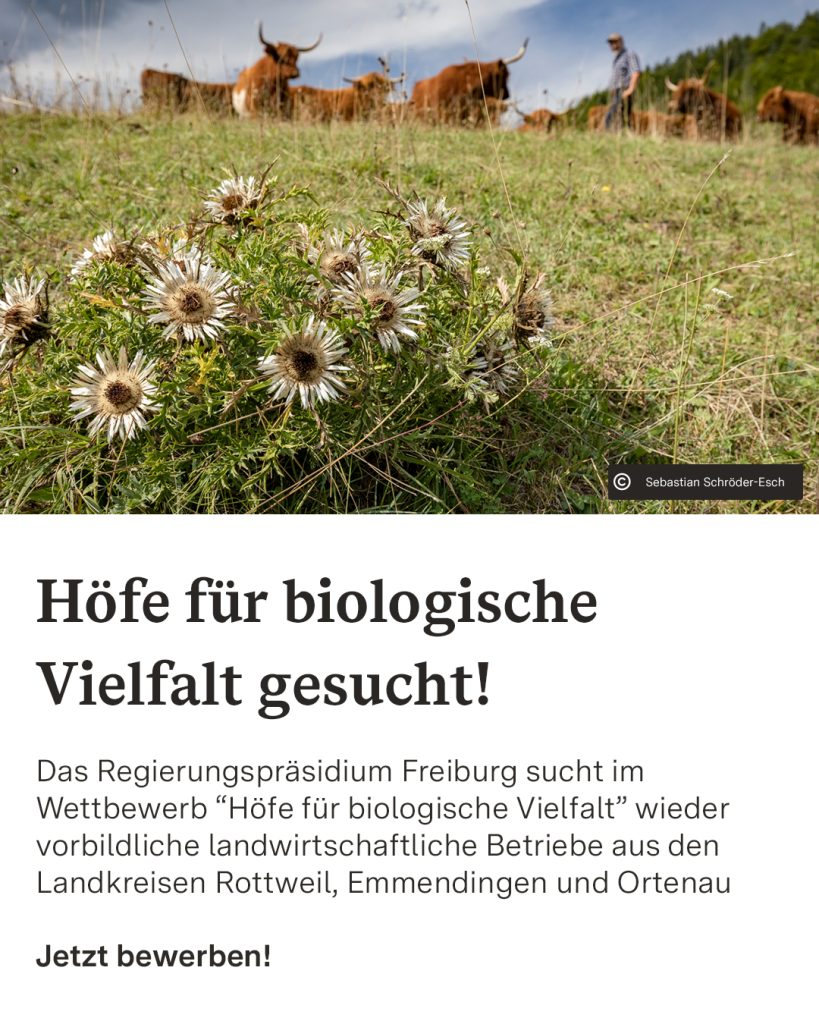 Für den Wettbewerb „Höfe für biologische Vielfalt“ werden landwirtschaftliche Betriebe gesucht. Dieses Jahr aus den Landkreisen Rottweil, Emmendingen und Ortenau. Bewerbungen sind ab sofort bis 30. April möglich.🏆🌱